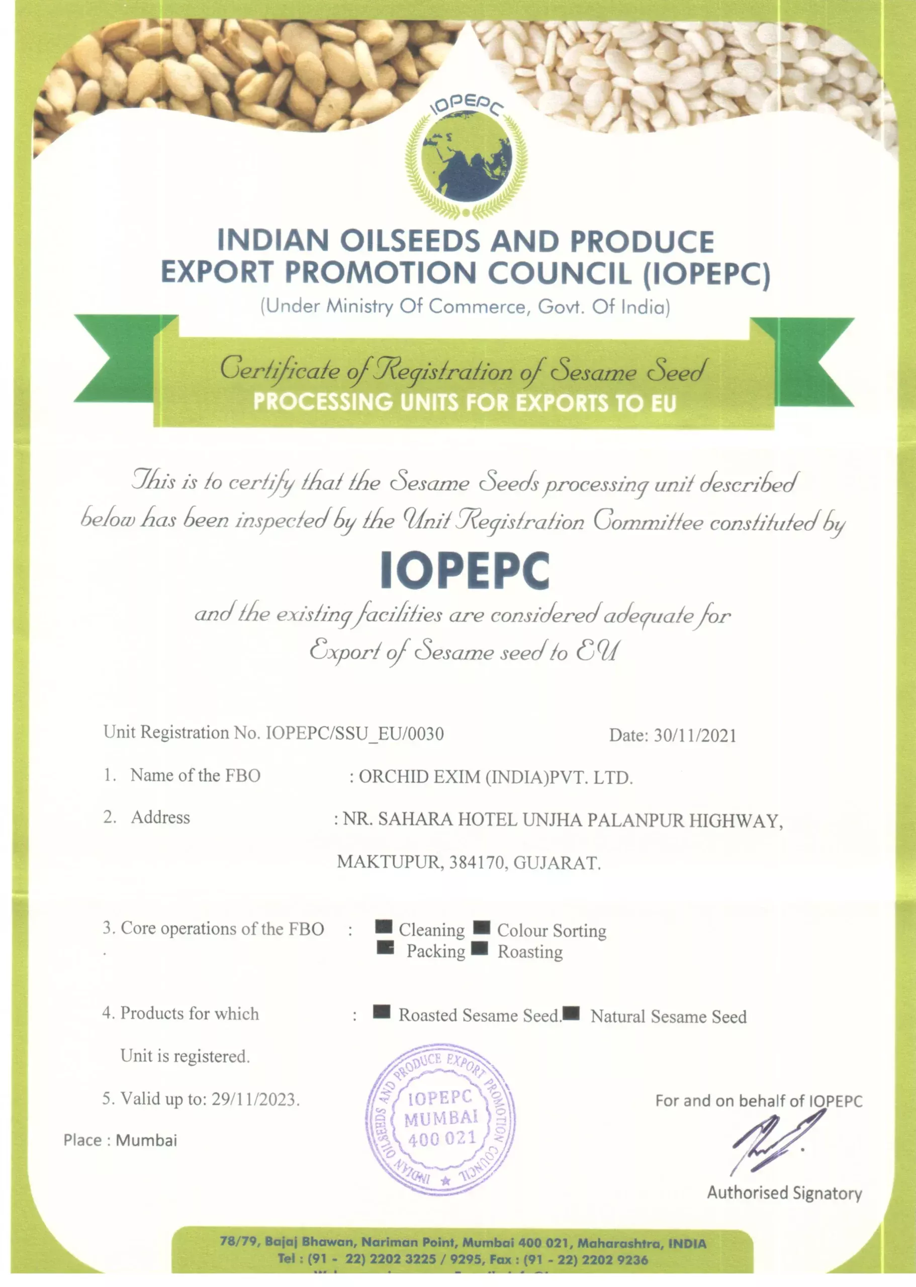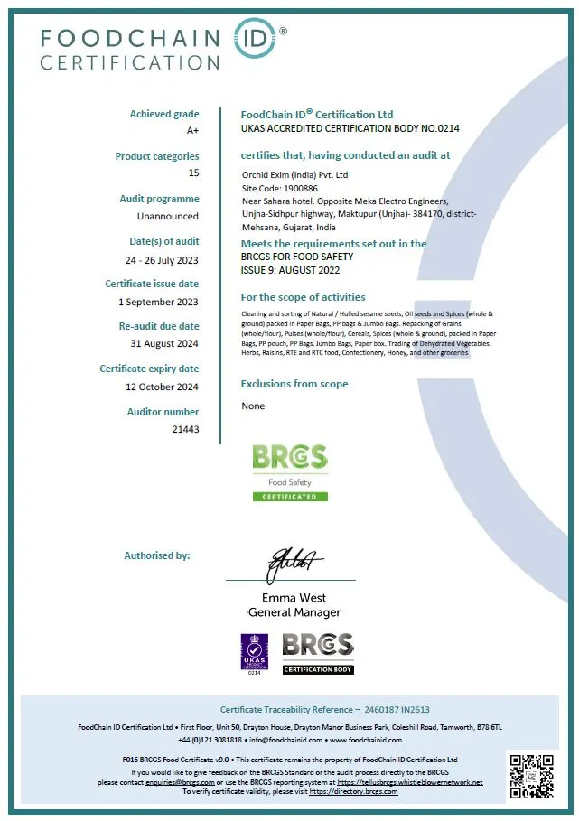 Certificate confirms that Orchid Exim complies with BRCGS standards for food safety, ensuring their processes meet the high standards required for food safety management systems.