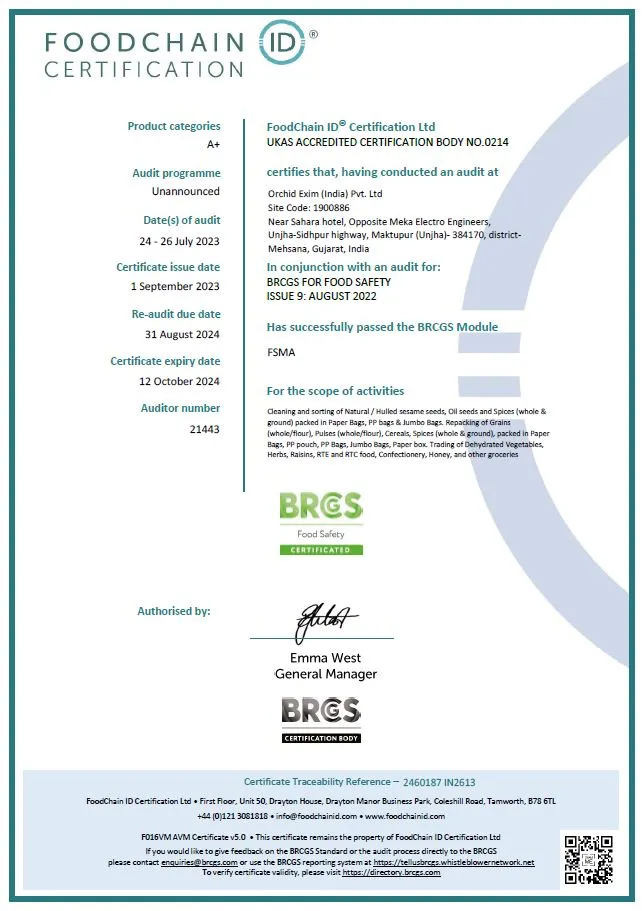 Certificate confirms that Orchid Exim has successfully met the requirements set out in the BRCGS for Food Safety, Issue 9: August 2022. It highlights that we passed the BRCGS Module for FSMA