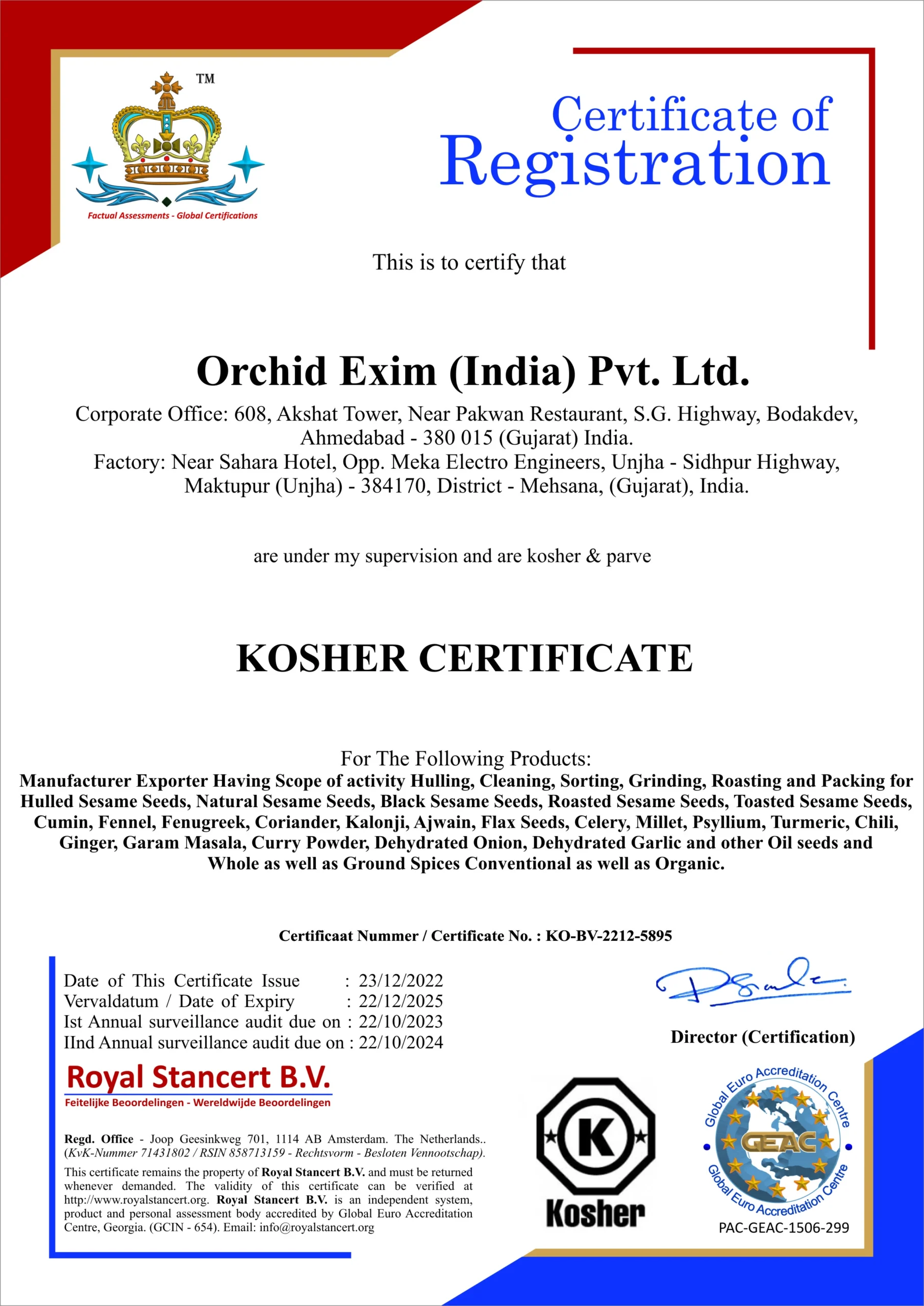The certificate states that Orchid Exim is under the supervision of Fartani Assesmenh - Global Certifications & that their products are kosher and parve. Parve means that the food does not contain meat or dairy products.