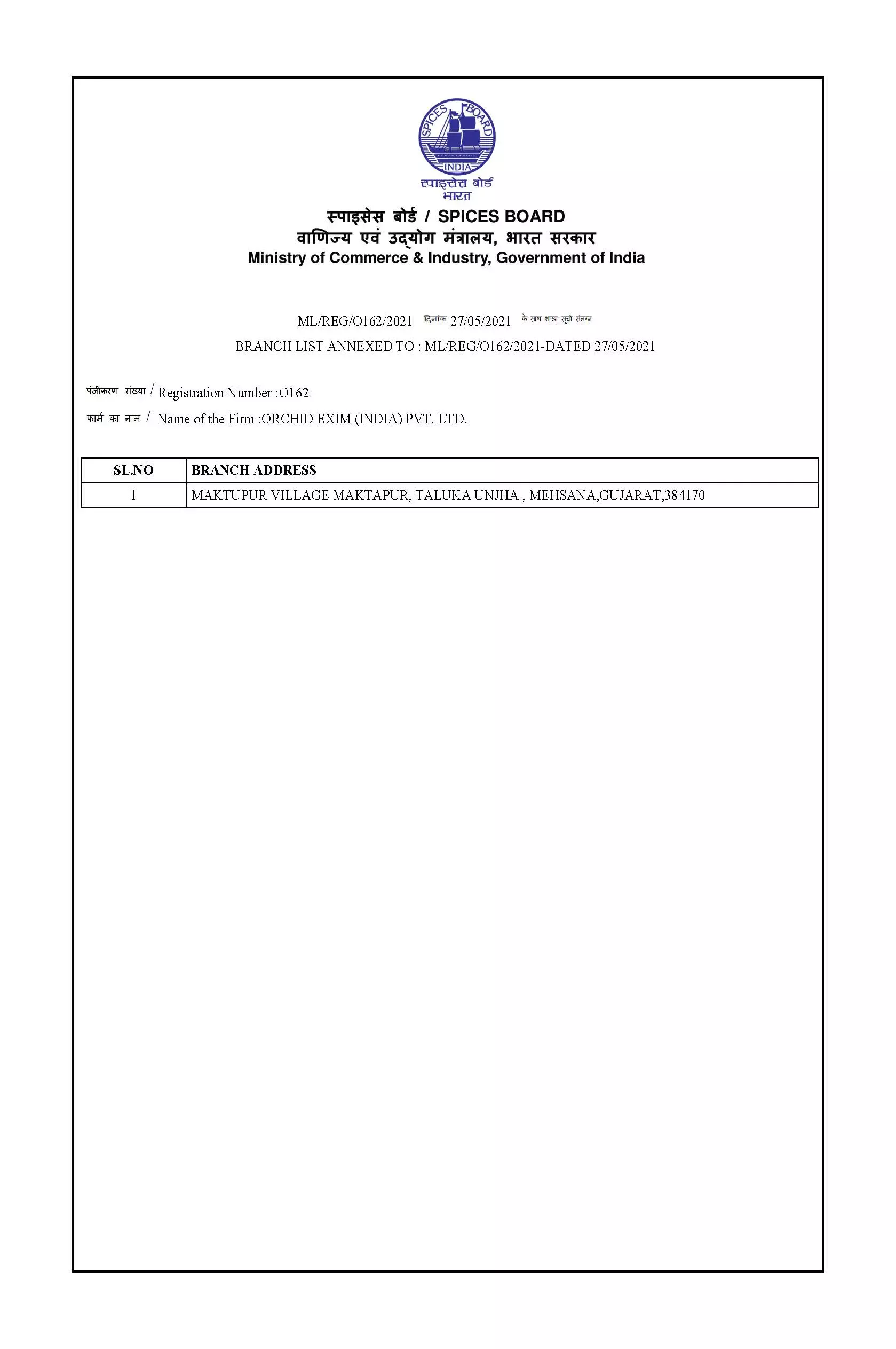 Certificate authorizes Orchid Exim to operate as an exporter of spices from India, adhering to the conditions specified in the Spices Board Regulations, 1989, and the instructions issued by the Spices Board.